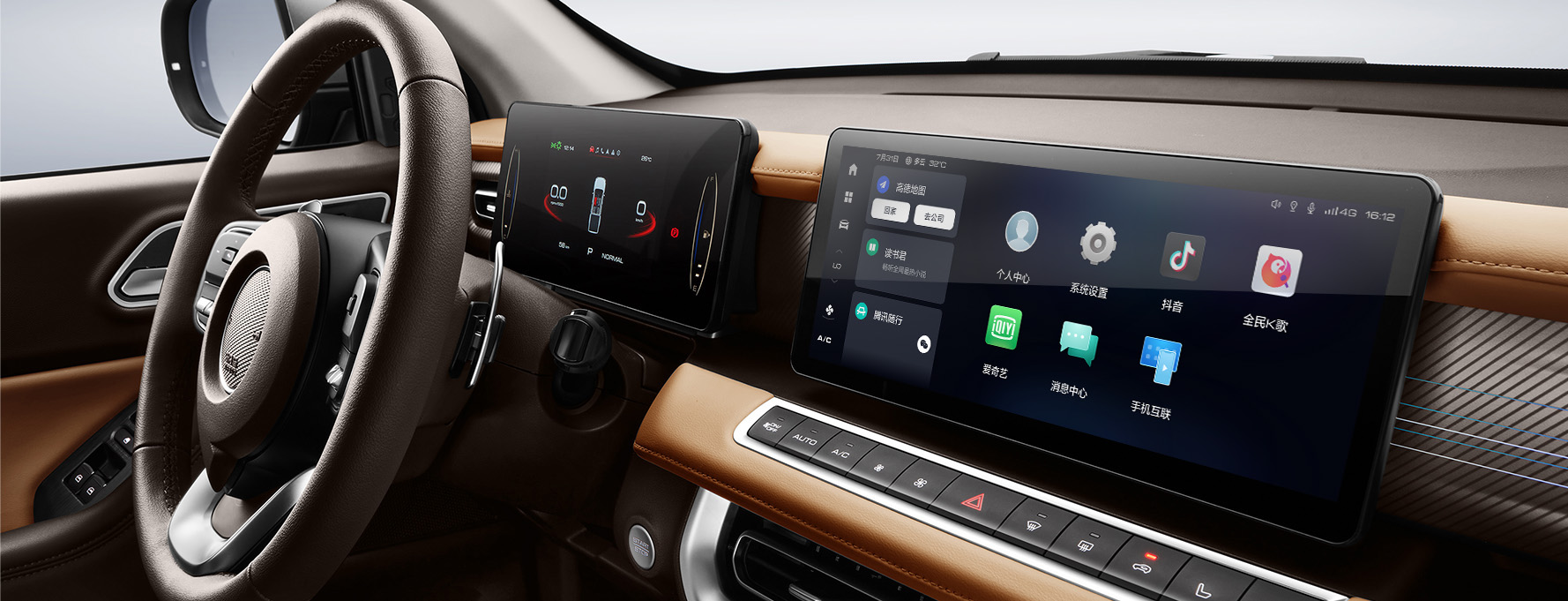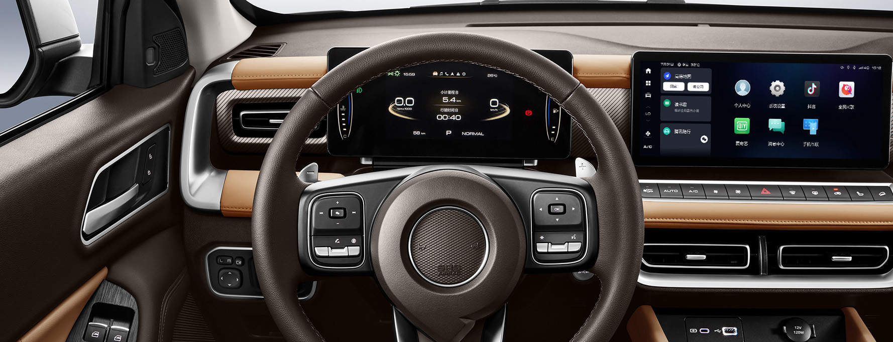 精致科技风内饰,大面积软质包覆,7英寸彩色液晶仪表+12.3英寸智联触控屏双悬浮设计,搭配航空挡杆