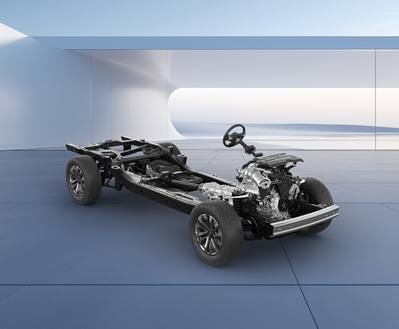 采用高强度笼型车身(车身分为溃缩吸能区及高强度座舱区,能在碰撞发生时吸收碰撞能量,有效减少驾驶室的变形)+梯形车架(车身骨架应用高强度钢)