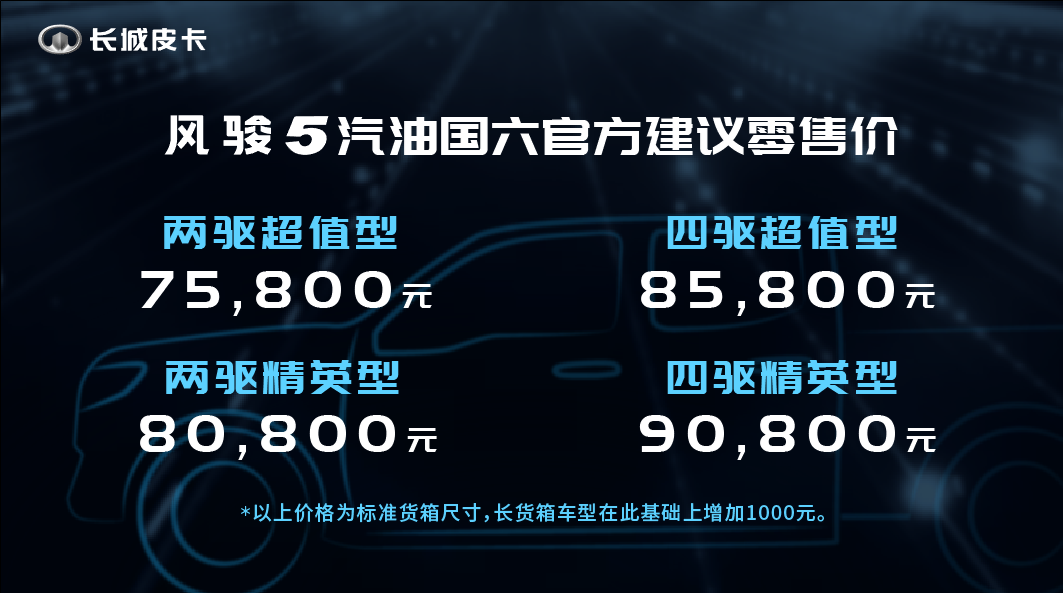 作为中国第一家同时拥有汽、柴油国六车型的皮卡品牌,在本次风骏新品发布会上,长城皮卡风骏5汽油国六和风骏7新冠军版同步上市。